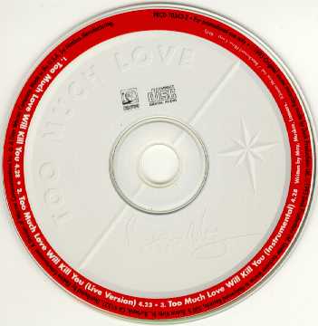 | United States | TOO MUCH LOVE WILL KILL YOU/Too Much Love Will Kill You(live)/Too Much Love Will Kill You(piano) [disc picture - 14k] | CD5 ba | Hollywood PRCD 10343 2 | mispressed promo | scarce | definite |